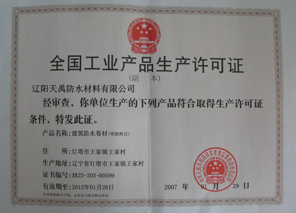 位于全国最大的化纤材料基地--辽阳-辽阳市王家工业园区,占地面积5000余平,是防水行业集科研、生产、销售于一体的高新防水技术专业厂家,企业先后取得国家质检总局颁发的"工业产品生产许可证",并正在通过质量保证体系的认证。 |